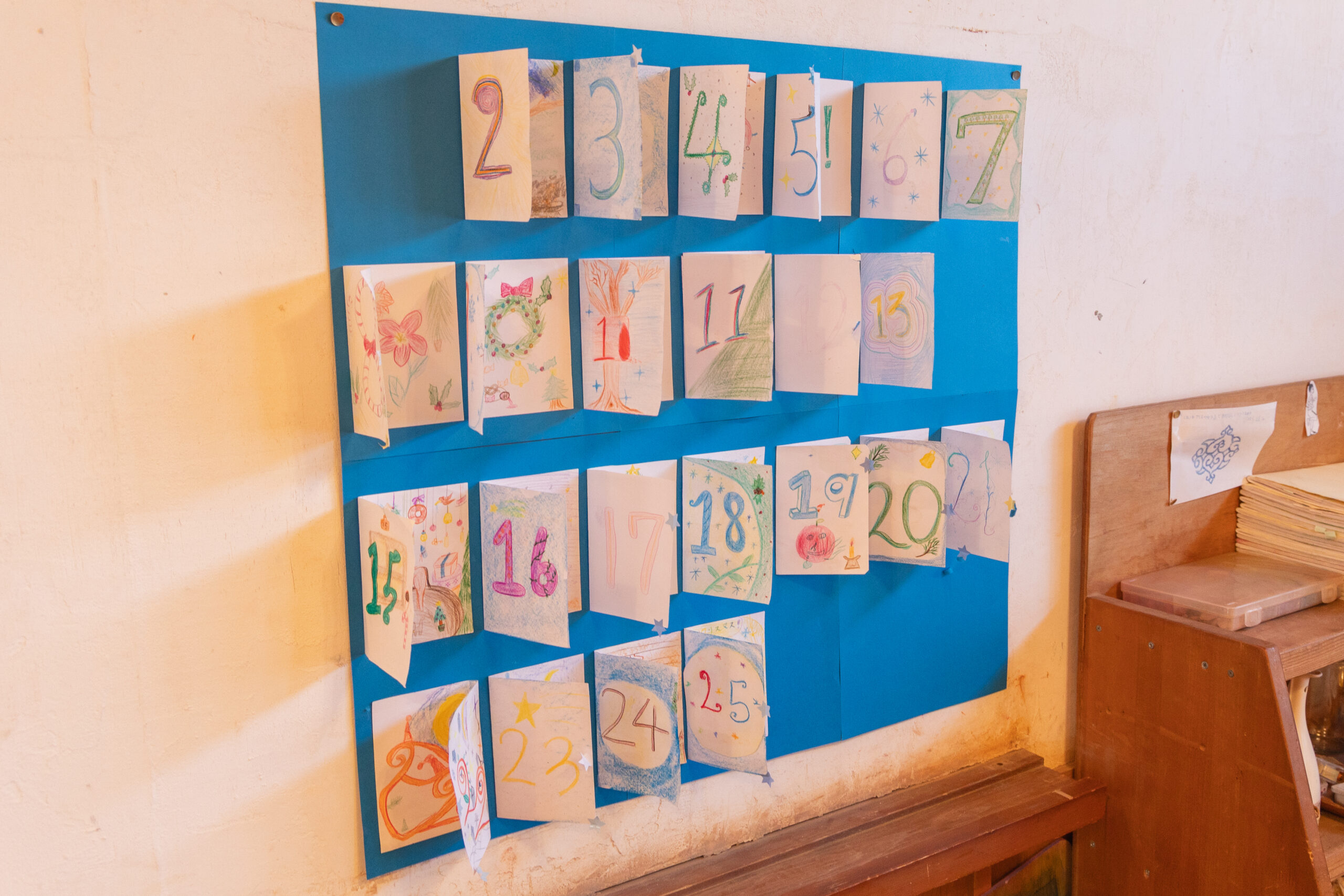 教室には毎年異なる美しいアドベントカレンダーも飾られています。壁かけの絵のとびらを開けていくものや、小さなきんちゃく袋が日数分並んだものなどタイプはさまざま。また、鉱物学の学びに合わせて石の入ったアドベントカレンダーが用意されていたり、全員でアドベントカレンダーを手作りしたクラスもあるそうで、教室それぞれで趣向が凝らされています。